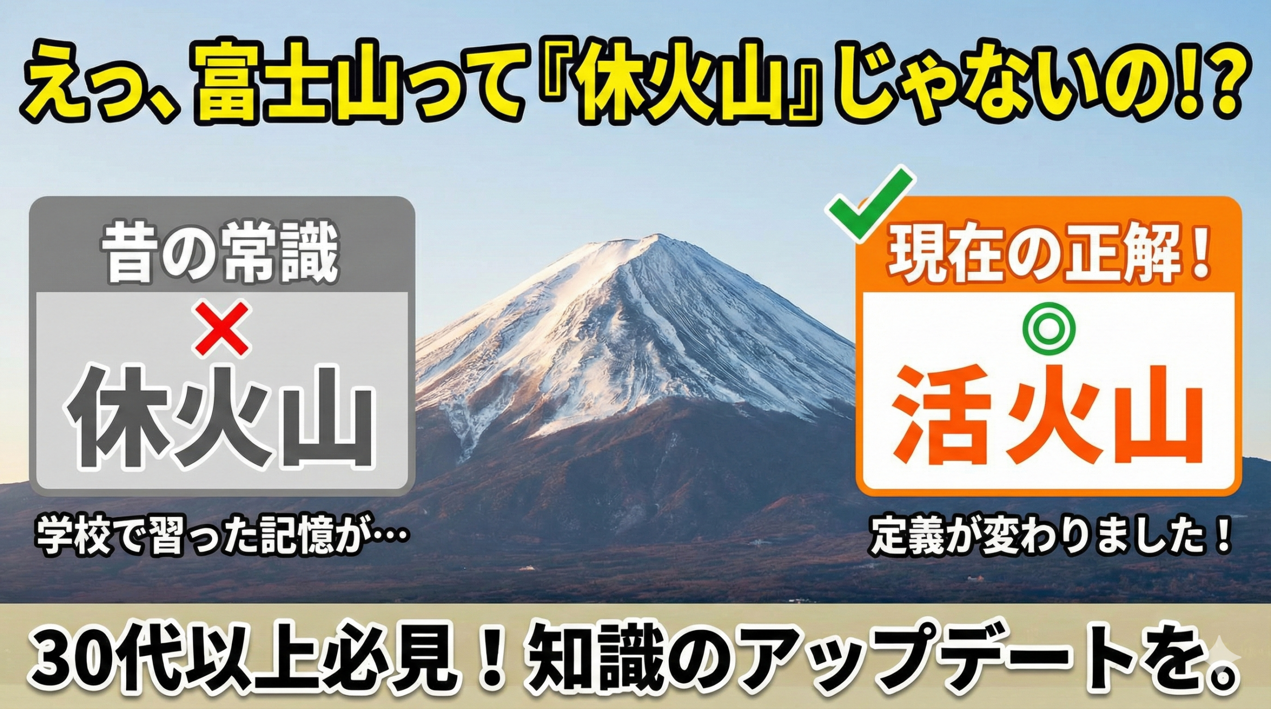 もし、お子さんやお孫さんに「富士山って休火山だよね?」と聞かれたら、「昔はそう言ってたけど、今は活火山って呼ぶんだよ。ちゃんと監視されているから大丈夫だけど、元気な山なんだよ」と教えてあげてくださいね。