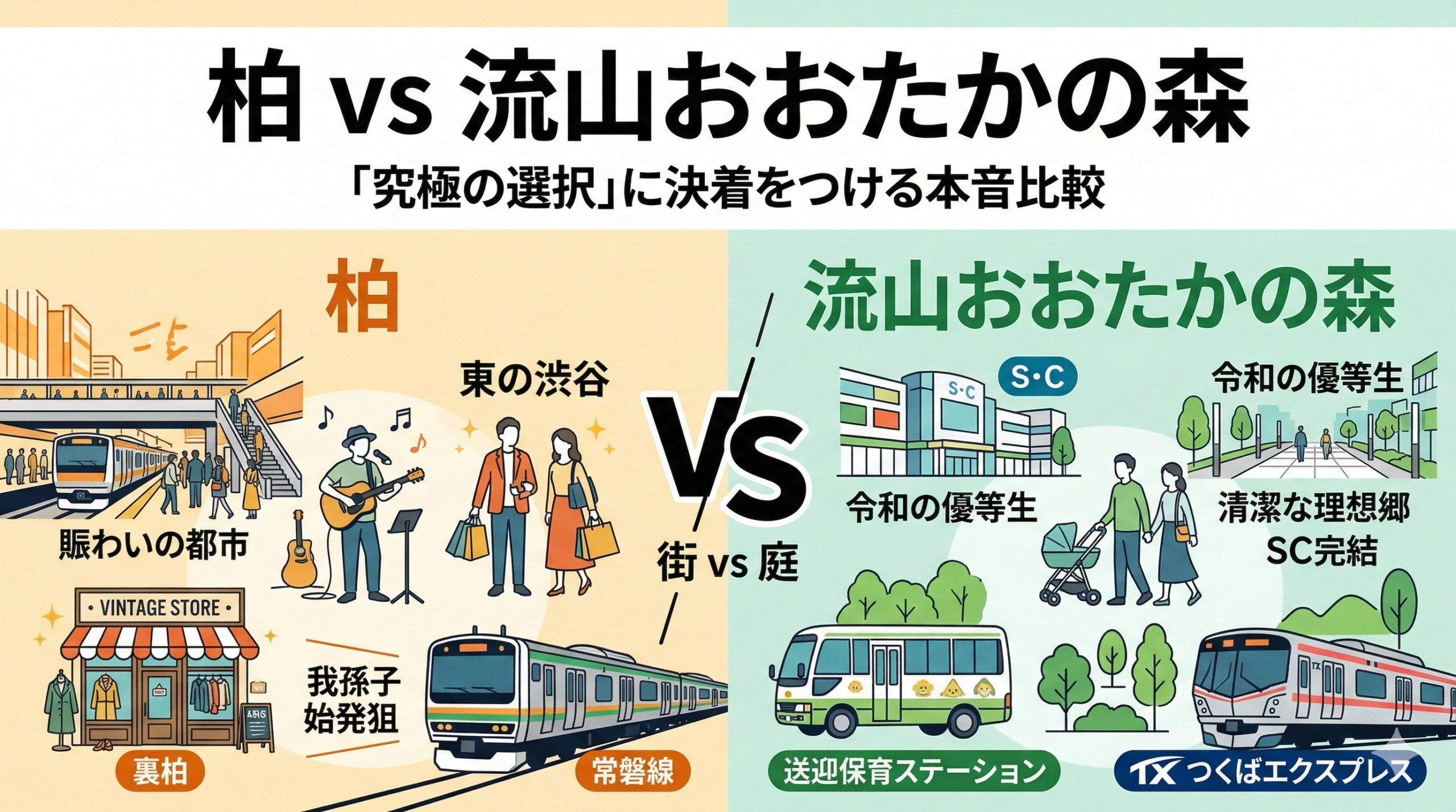 同じ東葛エリアにありながら、柏と流山おおたかの森は、まるで「昭和から続く大河ドラマ」と「最新の短編ネット映画」ほど世界観が違います。それぞれの駅前に10分立つだけで、そこに流れる空気の違いに気づくはずです。