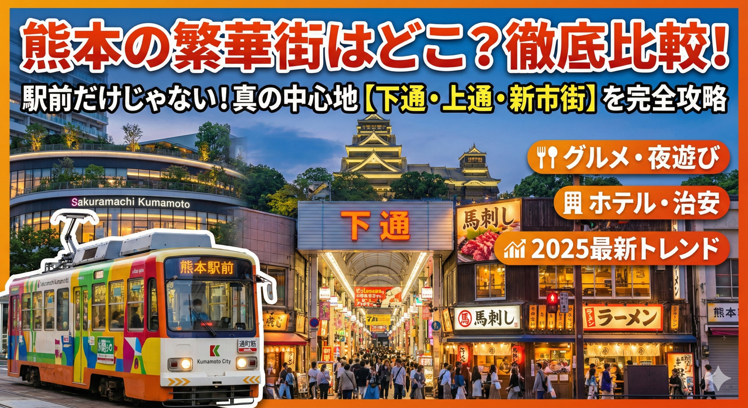 地元では「街(まち)」と言えば、熊本駅から市電(路面電車)で15分ほどの距離にある「下通・上通」周辺を指します。この記事では、迷わずに熊本を満喫できるよう、エリアごとの特徴や最新のトレンドを分かりやすく解説します。