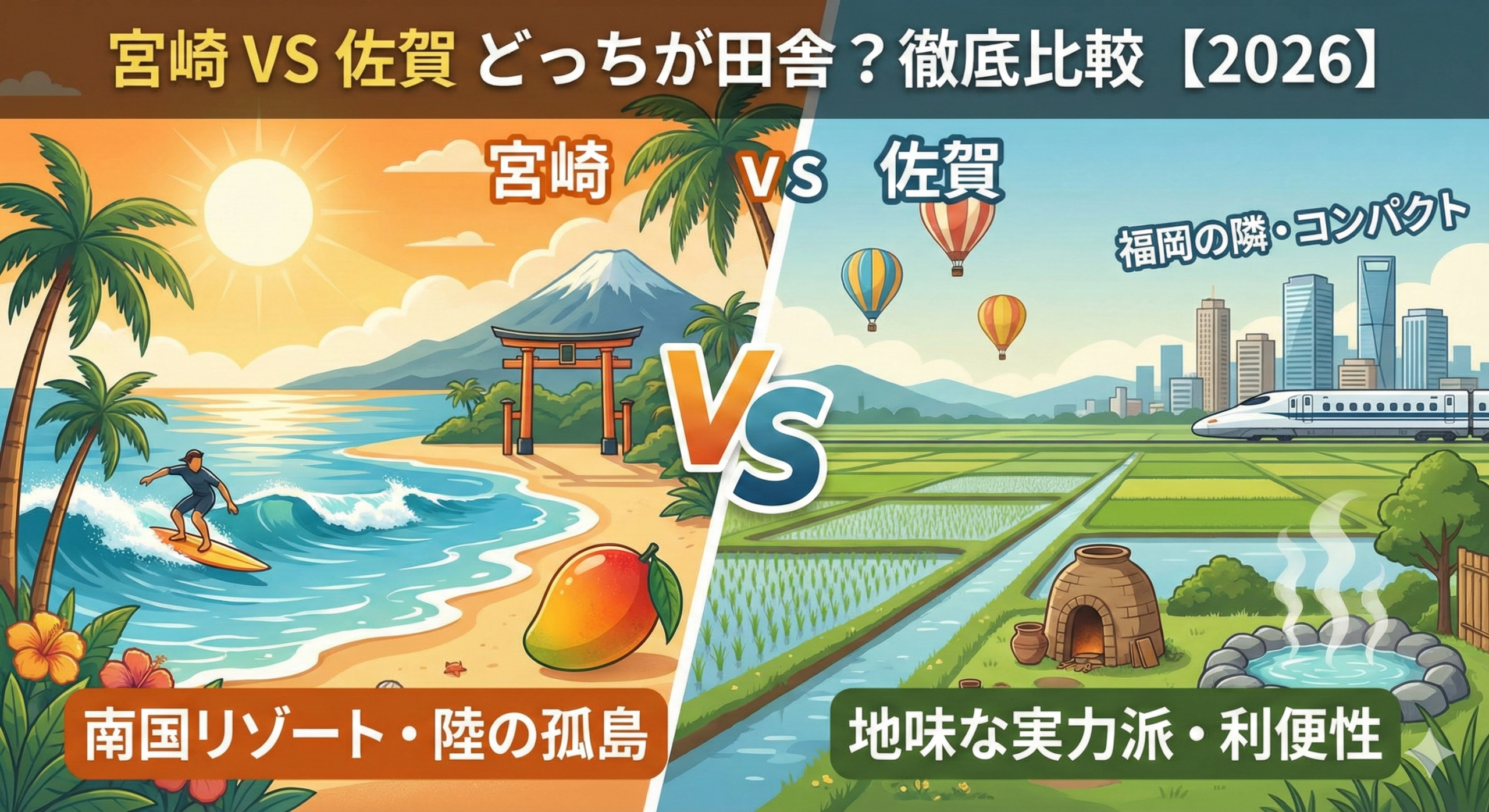 宮崎には「南国・リゾート」という強力なブランドがあり、全国的な知名度も高いです。一方の佐賀は「何もない」と揶揄されることも多く、イメージ戦略の面では宮崎よりも「素朴な田舎」という立ち位置にあります。