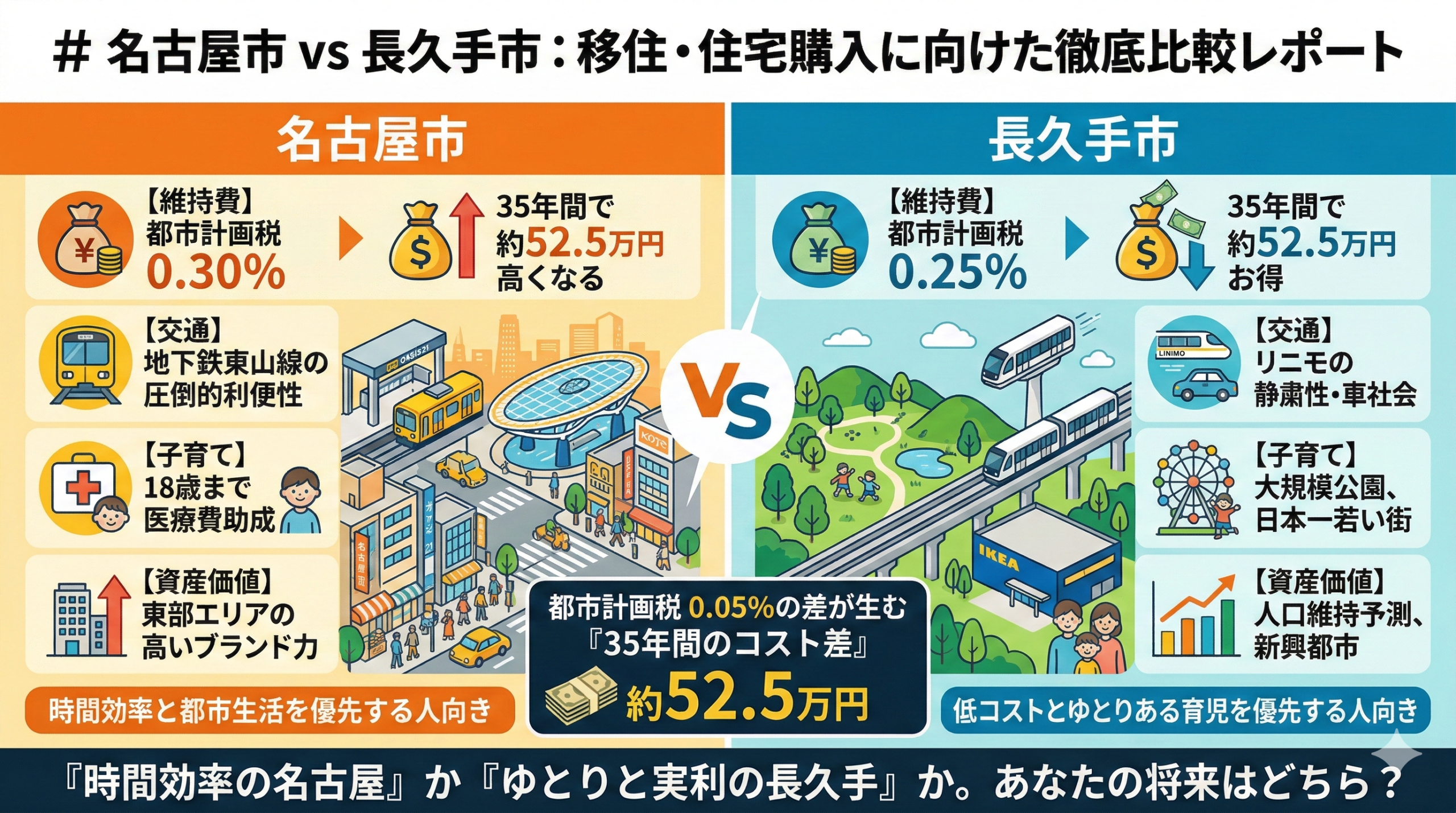 名古屋市と長久手市。隣接しながらも対照的な特性を持つ両市ですが、最終的な判断基準は「コストの払い方」と「時間の使い方」に集約されます。