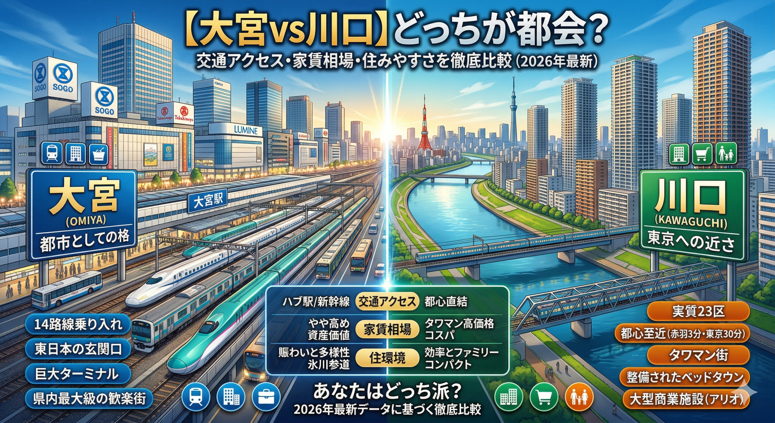 大宮と川口。どちらも「埼玉を代表する都会」ですが、その魅力は驚くほど対照的です。2026年現在の街の勢いと利便性を整理すると、答えは自ずと見えてきます。