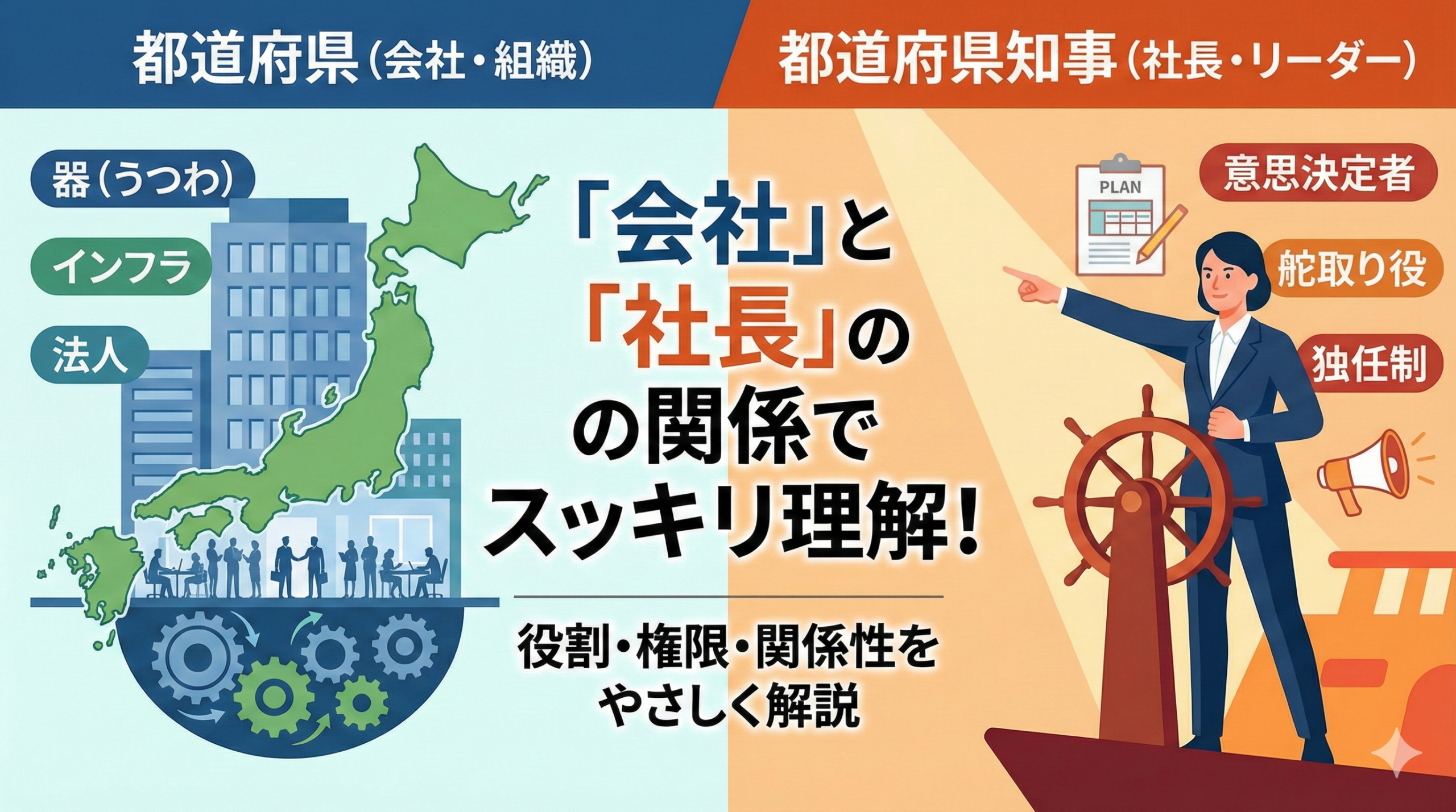 一言で例えるなら、都道府県は「会社」、都道府県知事は「社長」のような関係です。会社という組織(法人)が事業を行うために、社長という意思決定者が舵取りをするのと同様に、地方自治においてもこの二者は密接に関わり合っています。