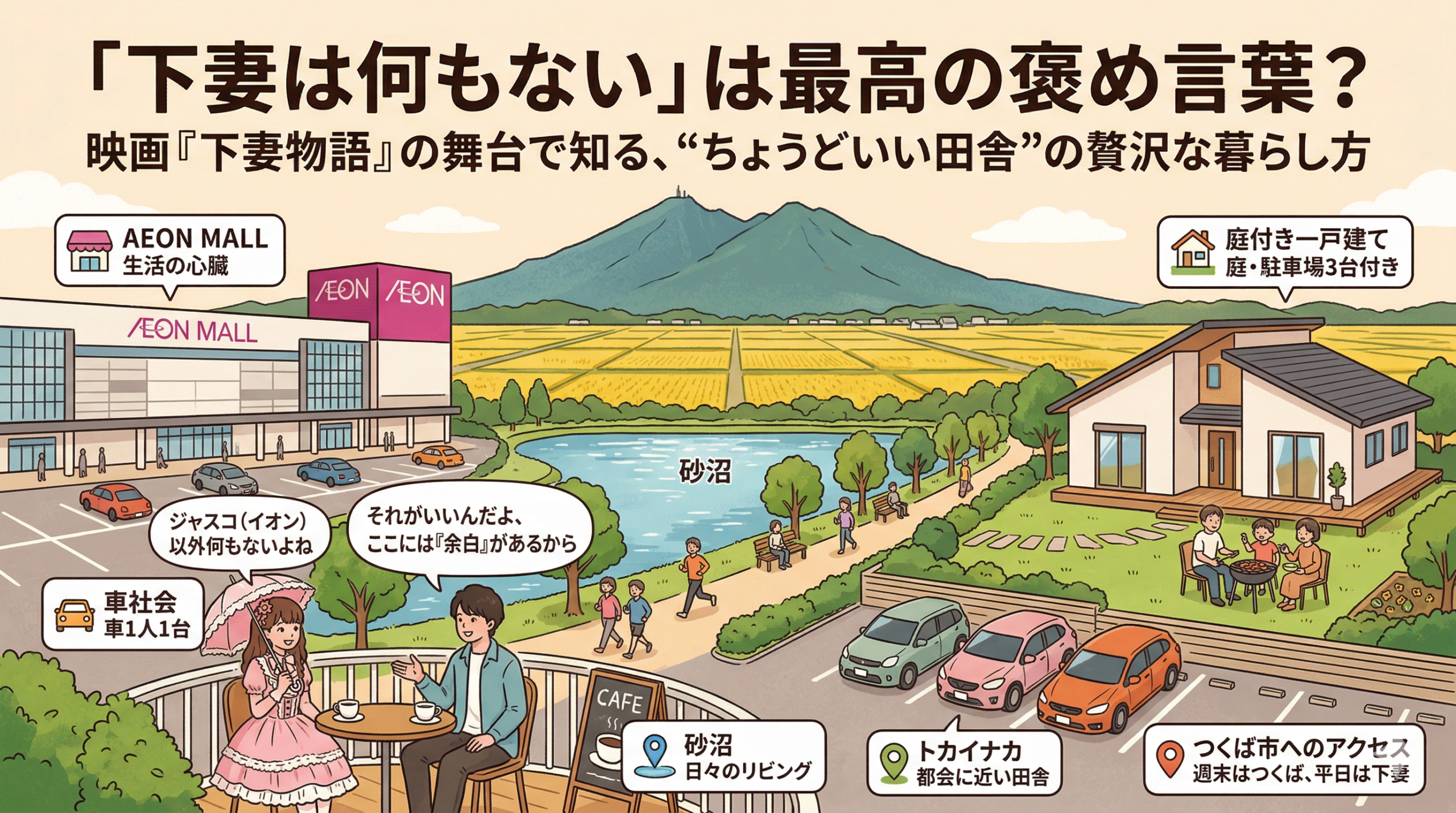 過酷な大自然に挑むほどハードではなく、かといって都会の喧騒に疲弊することもない。イオンという安心感と、砂沼という癒やし、そしてつくばという利便性を自在に使い分ける。そんな「ちょうどいい田舎」での暮らしは、私たちの人生に心地よいリズムをもたらしてくれます。