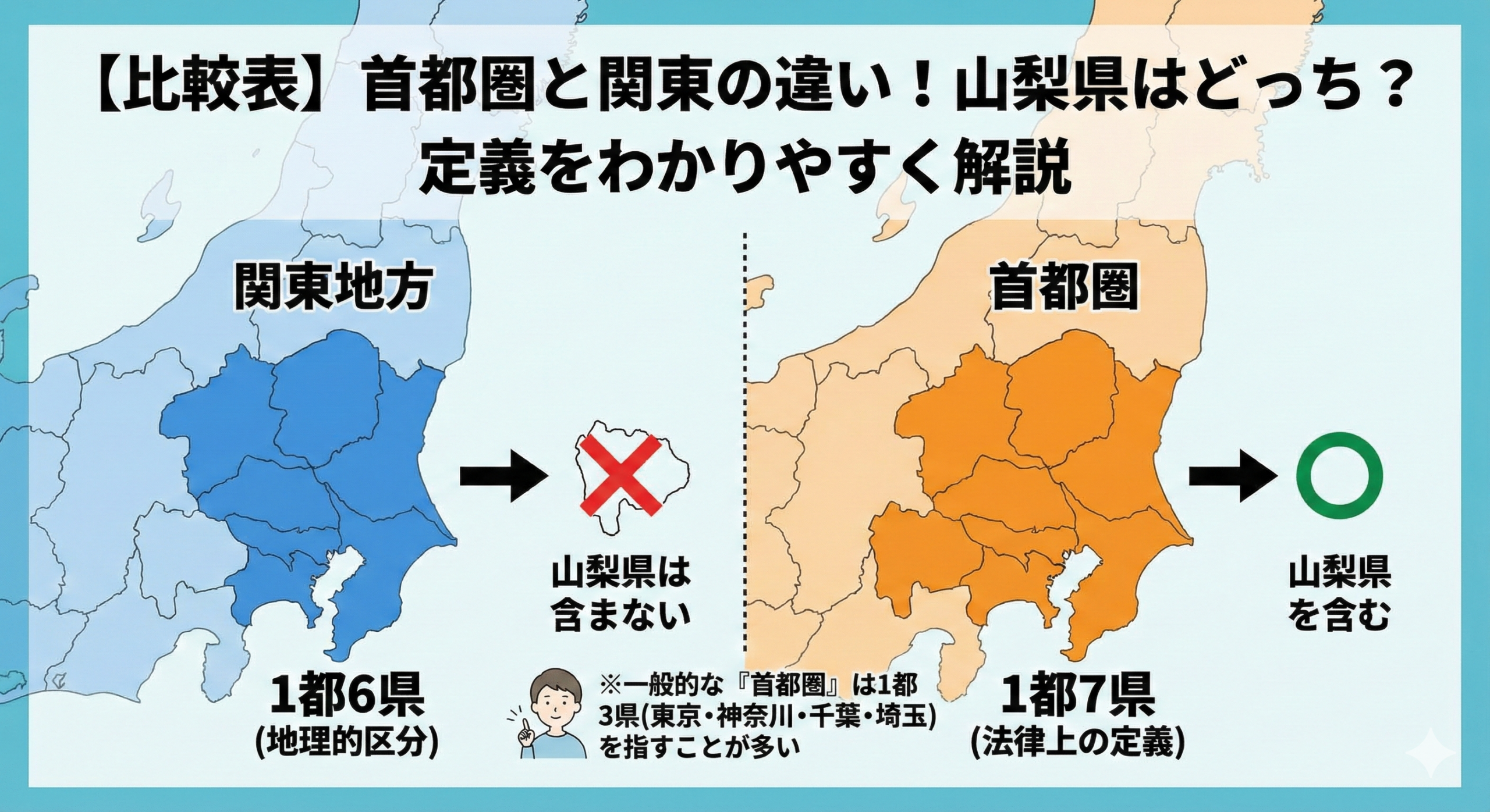 「関東」と「首都圏」の決定的な違いを一言で言うと、「山梨県を含むかどうか」、そして「地理的な区分か、政治・経済的な区分か」という点です。