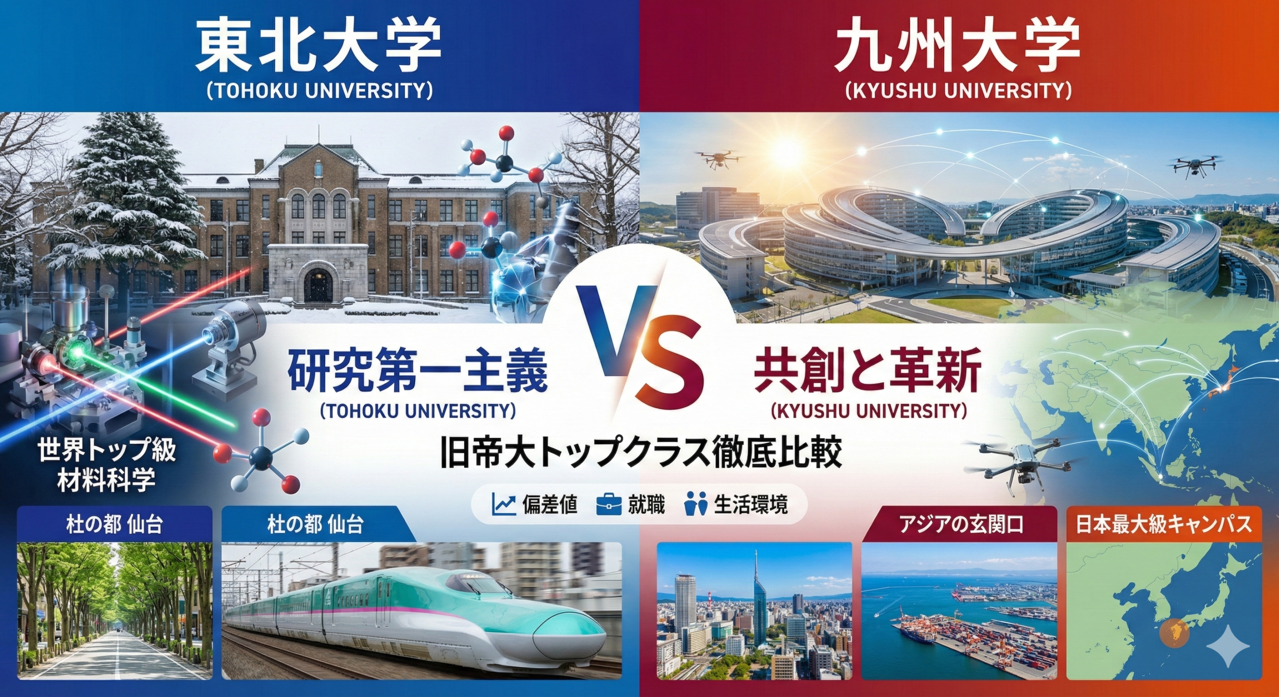 偏差値という物差しだけでは測れない、それぞれの大学が持つ「研究のDNA」や「卒業後のブランド力」。そして、仙台と福岡という全く異なる都市での「4年間の生活の質」。