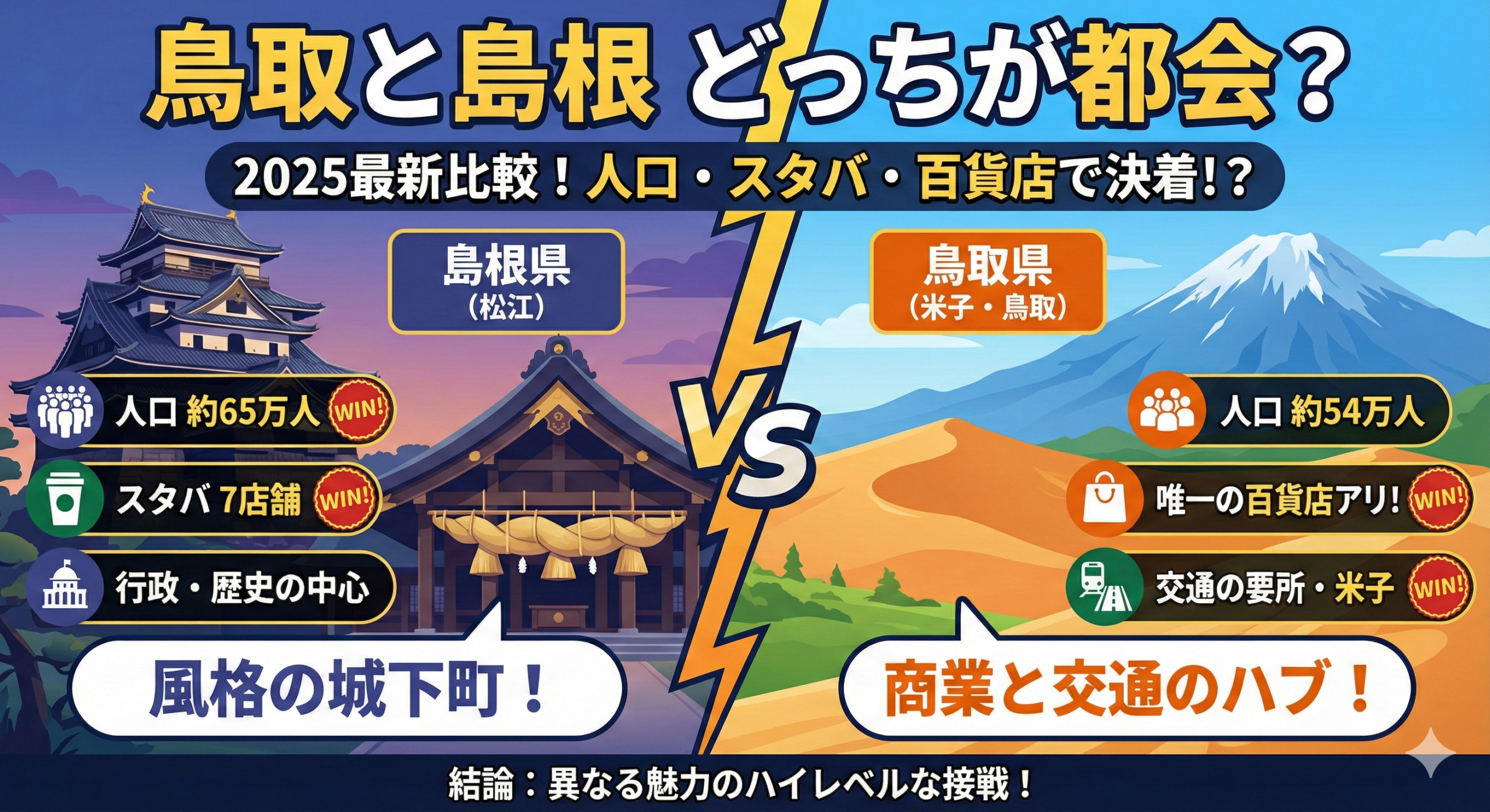 山陰地方の永遠のテーマとも言える「鳥取と島根、どっちが都会なの?」という疑問。どちらも人口が少ない県として知られていますが、実はそれぞれに異なる都会的な魅力と強みがあります。