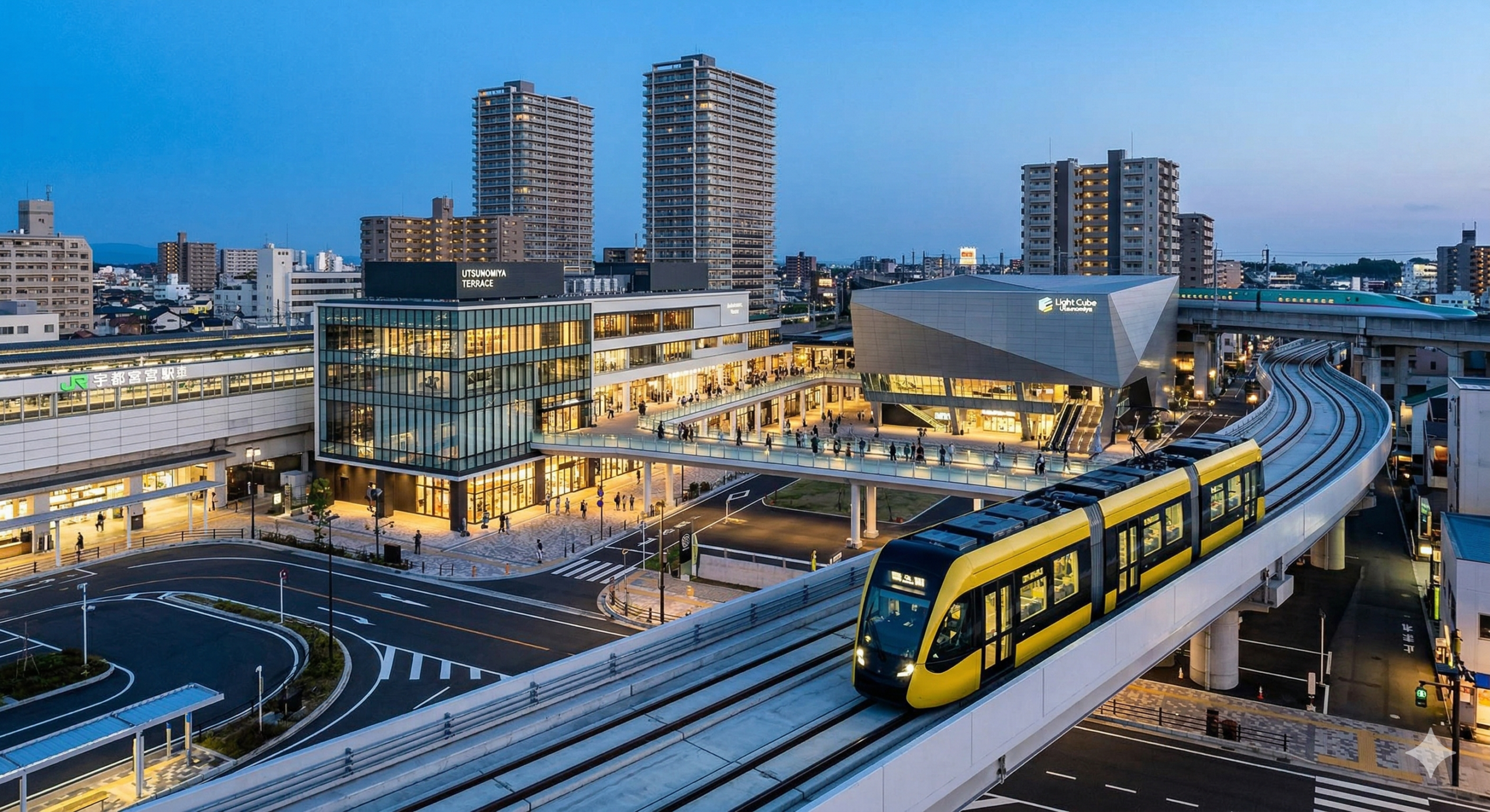 • ウツノミヤテラス: 飲食からライフスタイル雑貨まで揃う商業施設。テラスからはLRTが静かに発着する様子を眺めることができ、都市としての洗練を感じさせます。