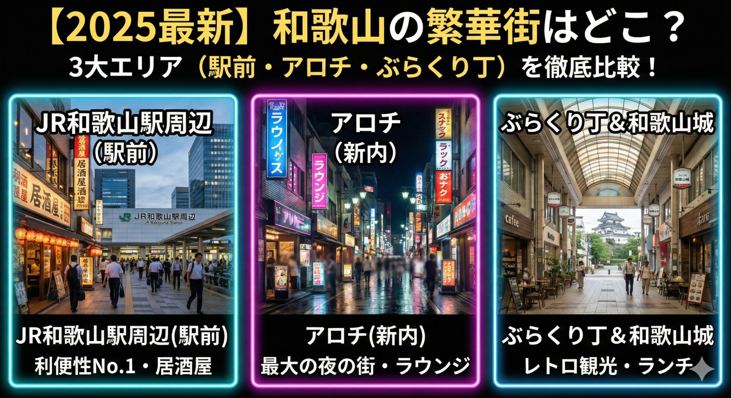 和歌山の繁華街は、主に「JR和歌山駅周辺」「アロチ(新内)」「ぶらくり丁」の3つのエリアに分かれており、それぞれ全く異なる表情を持っています。2025年現在の最新情報を踏まえ、あなたの目的にぴったりの場所が見つかるよう徹底解説します。