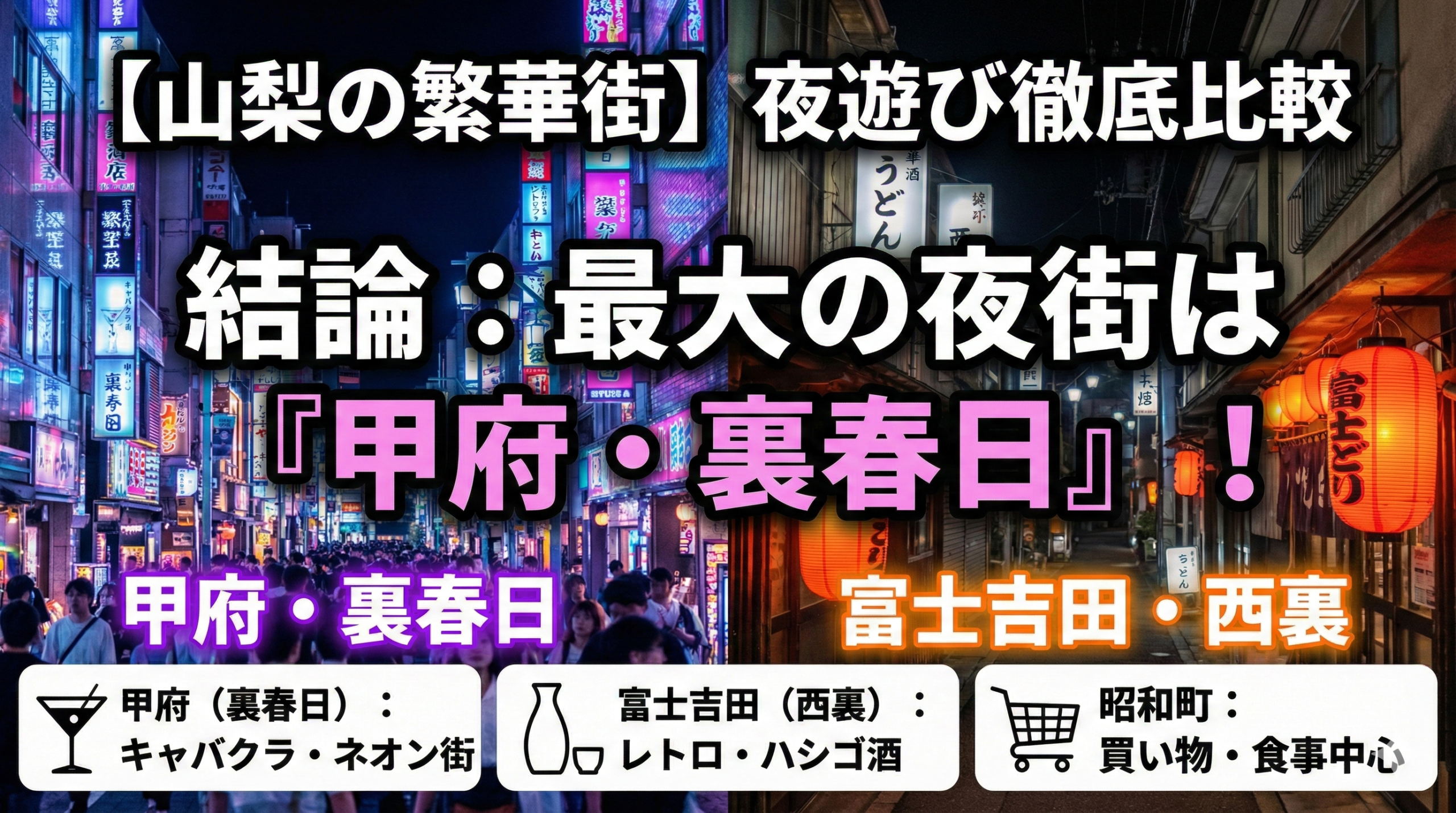 この記事では、山梨県内の主要な繁華街エリア(甲府・富士吉田・昭和町)の特徴を比較し、あなたの目的に合った「夜の街」を紹介します。