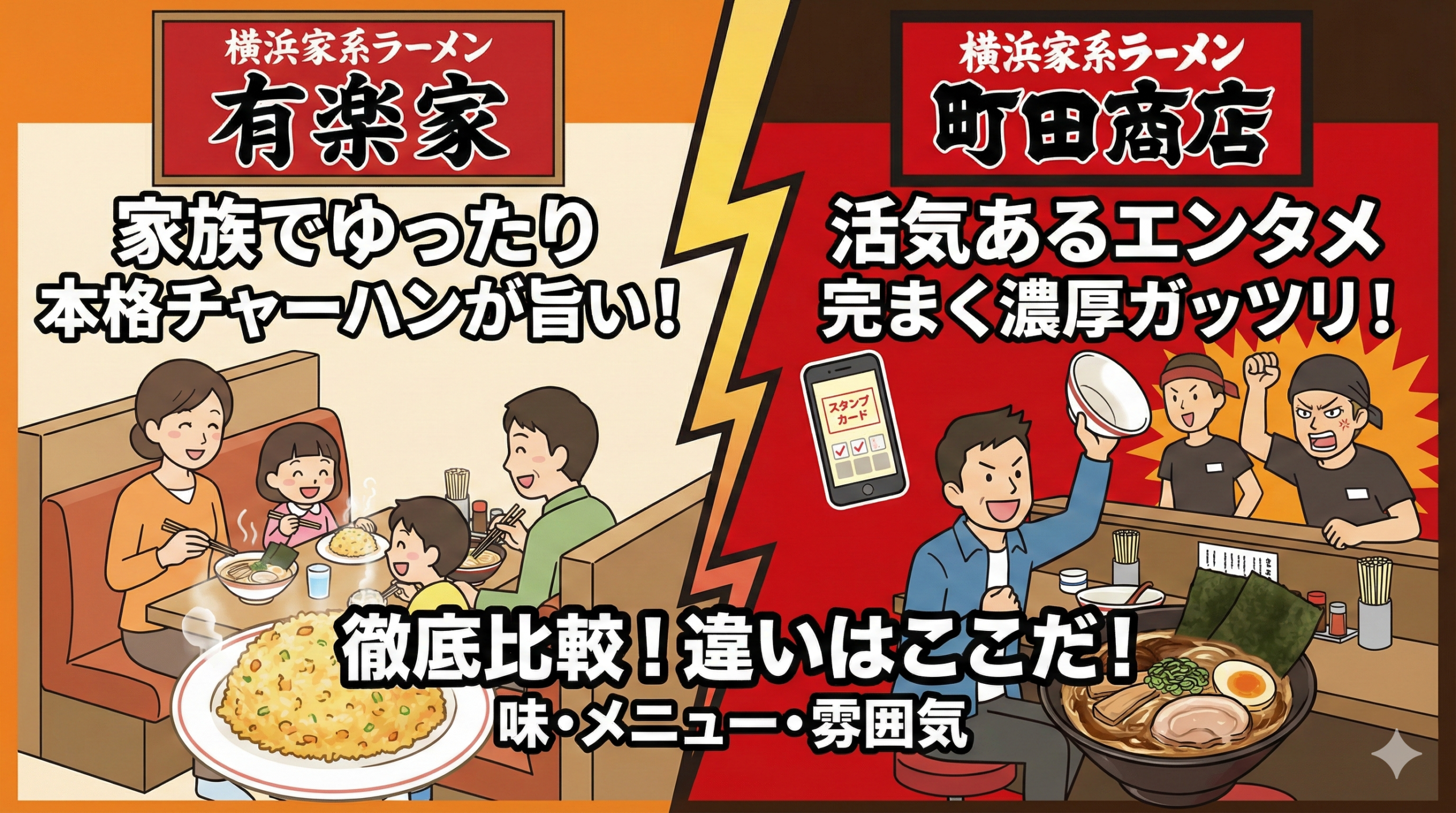 まずは、両店の違いが一目でわかる比較表をご覧ください。どちらもいわゆる「資本系(大手企業運営)」の家系ラーメンですが、ターゲット層が異なります。
